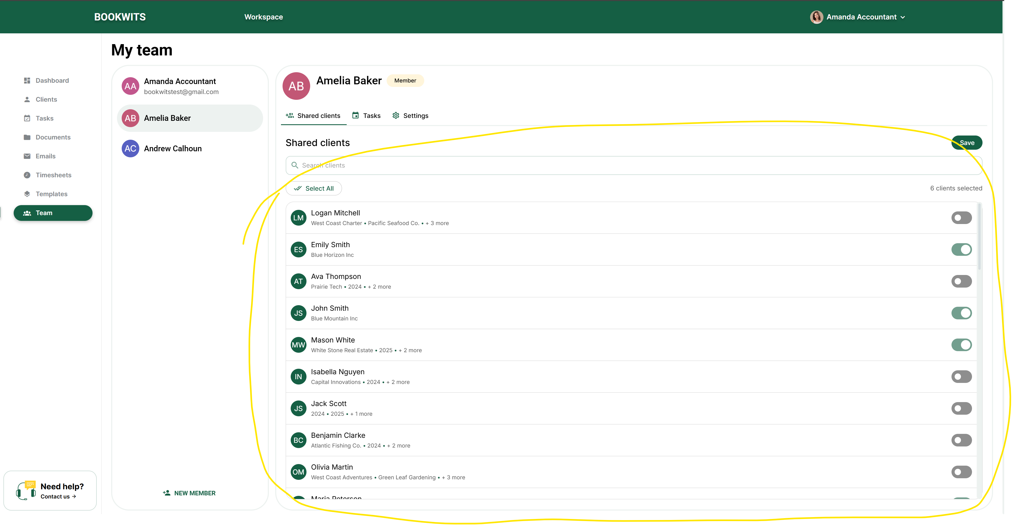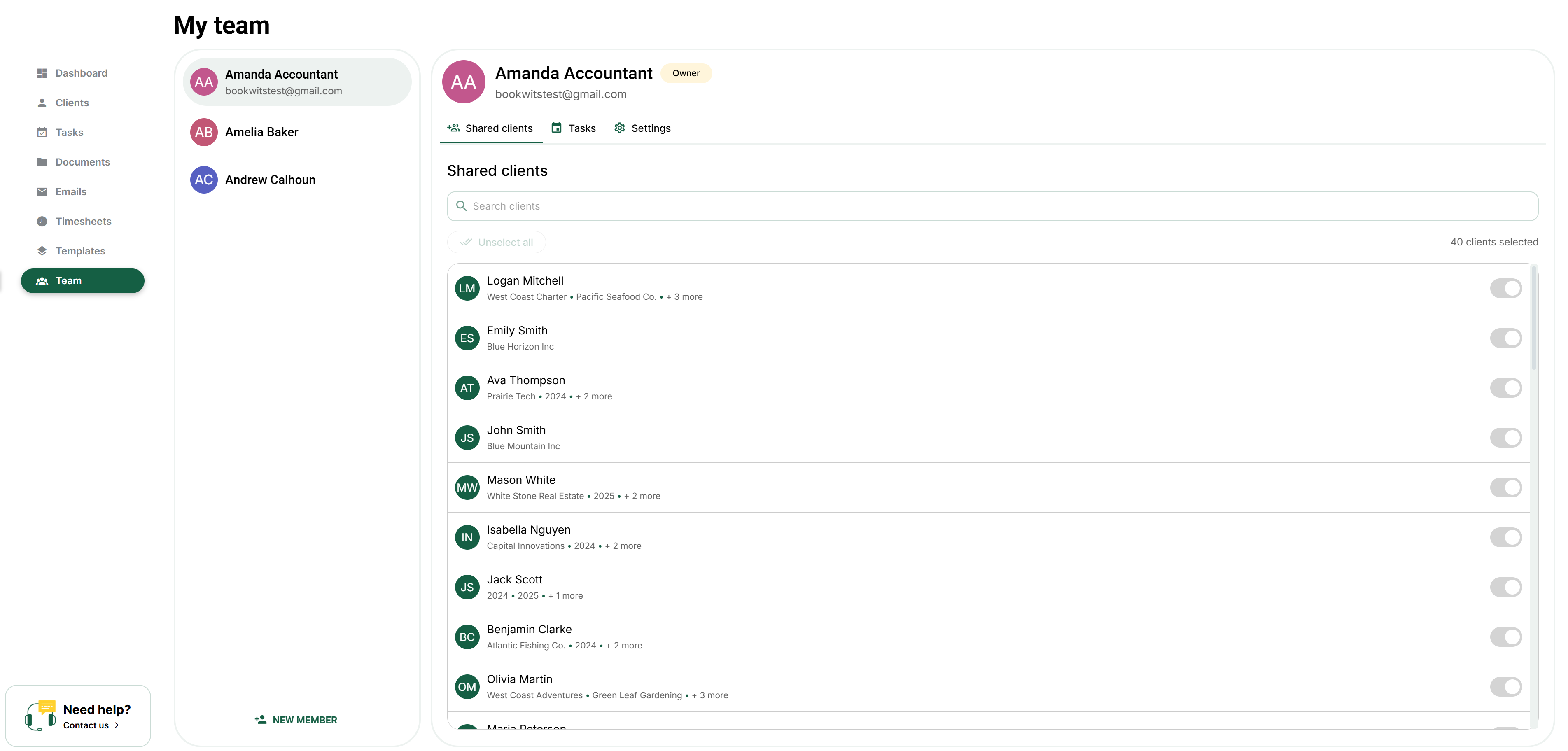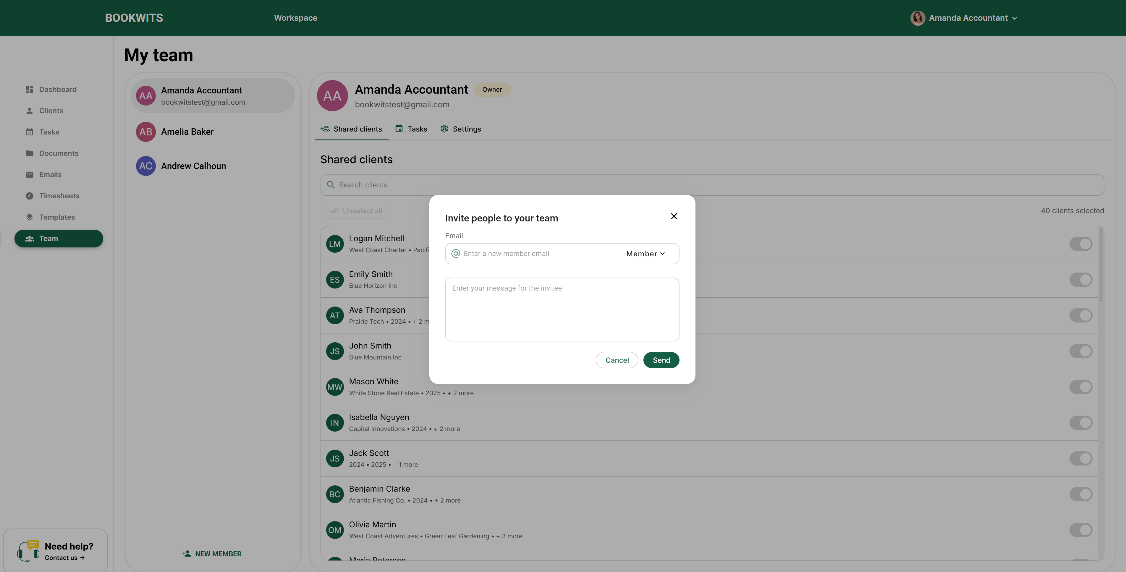 The Team module is where you invite staff, assign roles, control which clients they can access, and manage who is responsible for each client.