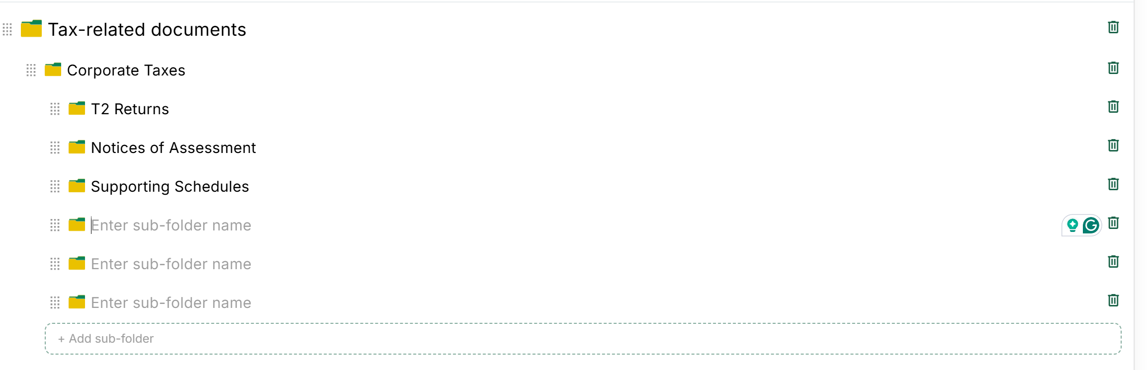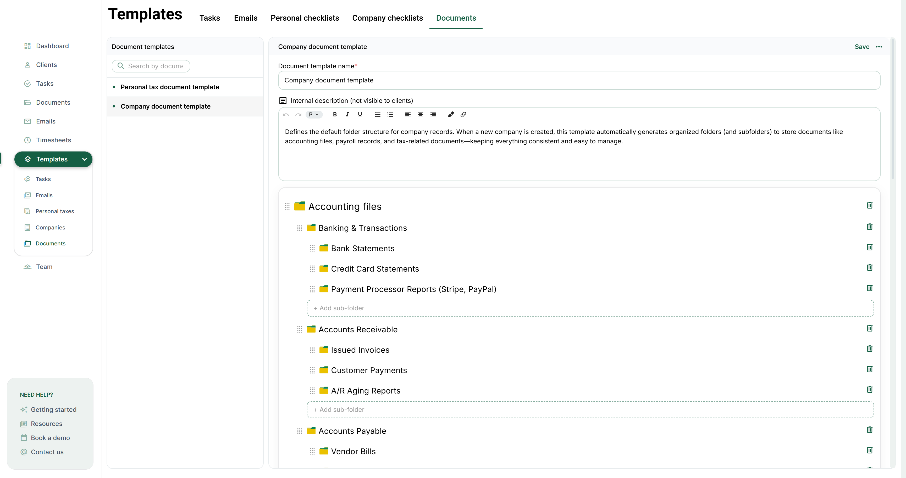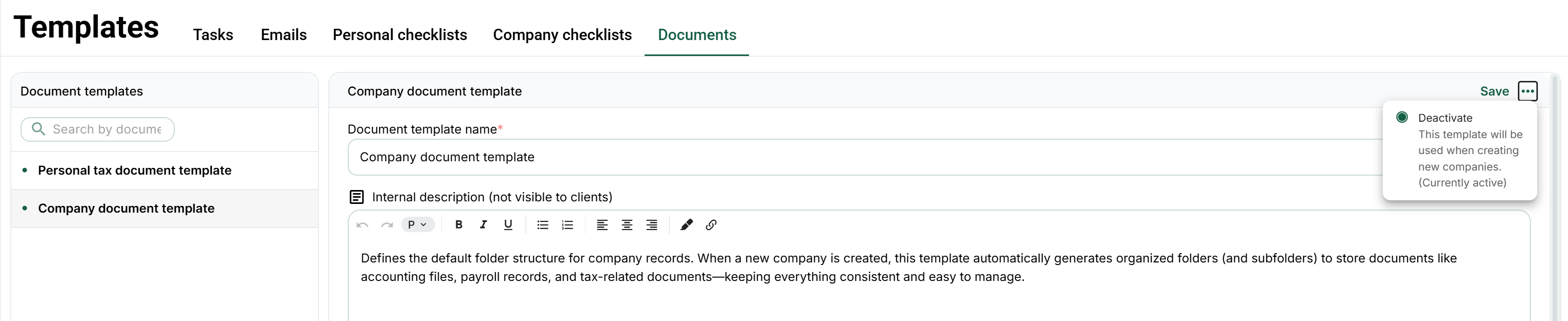 Les modeles de documents se trouvent dans Modeles → Documents. Ils vous permettent de definir une structure de dossiers par defaut qui est creee automatiquement lorsque vous ajoutez une nouvelle Entreprise ou une nouvelle Annee d'impot personnel, afin que les documents restent organises des le depart.